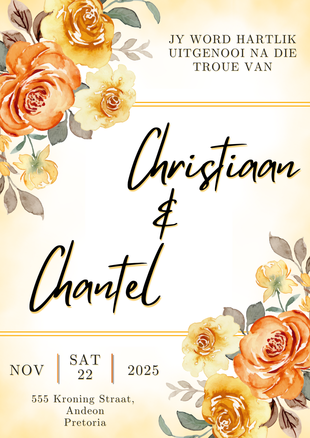 Yellow, Orange & Brown Wedding Invitation Template (Afrikaans | Canva Editable)